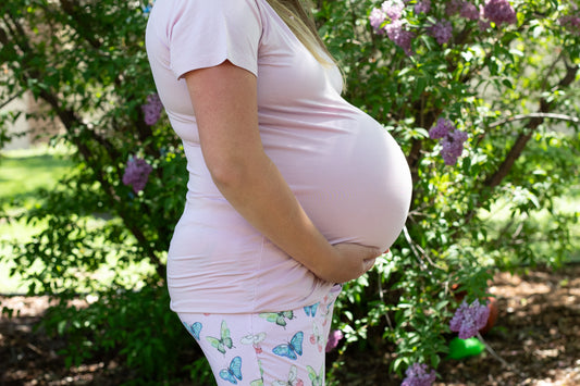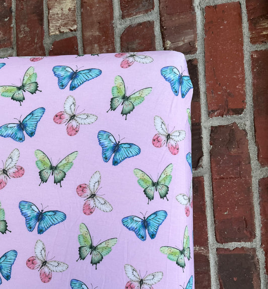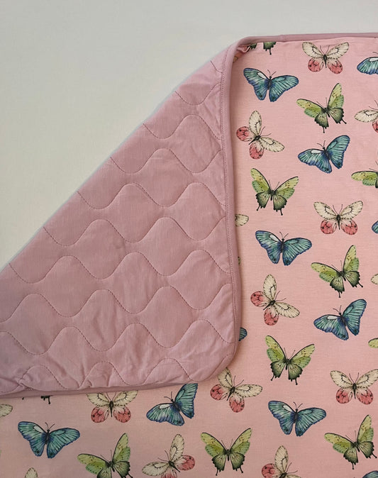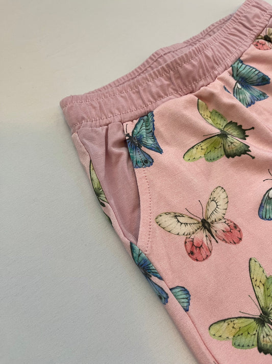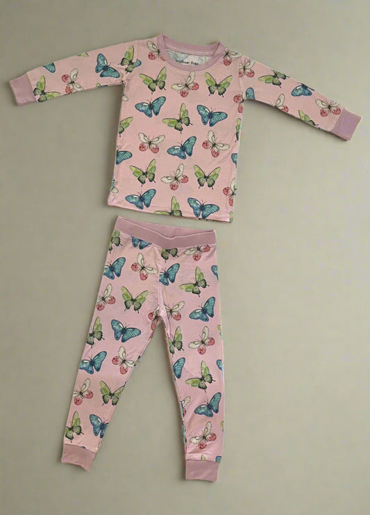 A beautiful print with watercolor pink, green and blue butterflies on a soft pink background.